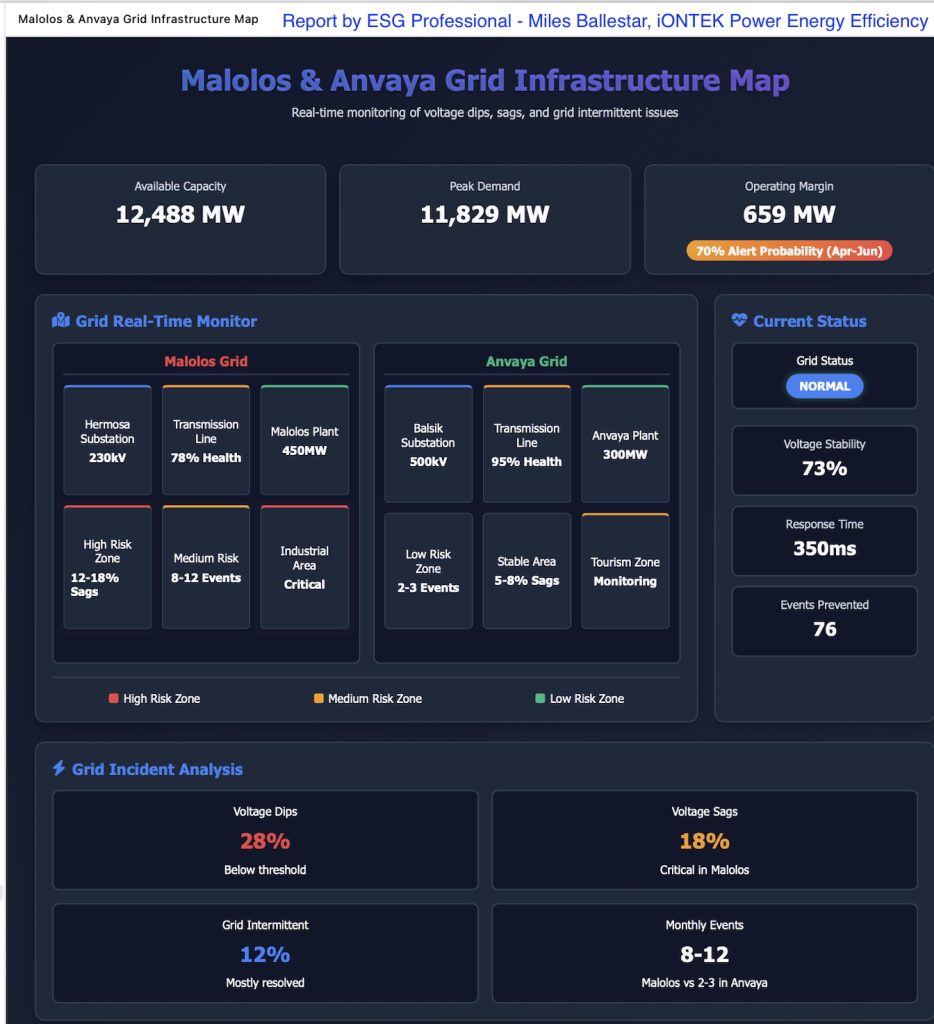 Critical Finding: While traditional analysis identified Malolos as experiencing 8-12 grid incidents monthly with 12-18% voltage sags versus Anvaya’s 2-3 incidents and 5-8% sags, GridShield’s AI-driven approach achieved 76 critical event preventions and 73% grid stability1,2.